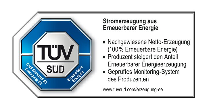 Das Siegel „TÜV SÜD ErzeugungEE“ belegt die Zertifizierung der Erzeugung von Strom aus erneuerbaren Energien (CMS Standard 83) und die Produktion lässt sich somit auf eine eindeutig identifizierbare Quelle zurückführen. Der Strom stammt vollständig aus TÜV SÜD ErzeugungEE zertifizierten Kraftwerken.